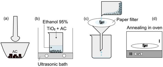 TiO2/AC preparation process: (a) Crushing TiO2-AC powder using a mortar and pestle, (b) Mixing the powder in 95% methanol under ultrasonic shaking, (c) Filtering the powder using a paper filter, (d) Annealing the powder in an oven at 160 °C.