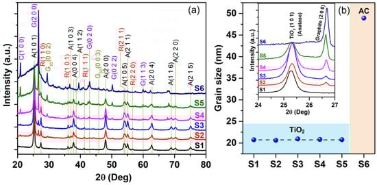 Meanwhile, the AC exhibited the diffraction peaks of graphite [e.g., G(002) at 26.6°, G(020) at 45.5°], carbon C(100) at 20.9°, and 3D carbon structures with peaks G3D(002) at 30.0°. The intensity of TiO2 and AC peaks varied reasonably with the evolution of TiO2/AC content (see Figure 2a). The inset of Figure 2b provides a zoom-in view of the TiO2(101) and G(200) peaks. The intensity of the G(200) peak increases monotonically with the rising AC content from S2 (TiO2/AC = 4:1) to S6 (TiO2/AC = 0:5). Reasonably, S1 (TiO2/AC = 5:0) does not exhibit the G(200) peak, whereas S6 lacks the TiO2(101) peak (Figure 2b inset). The dominant anatase phase over the rutile one for TiO2 Degussa P25 in this study is consistent with the results reported in ref. [32]. The XRD results are reasonable with the reported compositions of TiO2 P25, comprising 77.1% anatase, 15.9% rutile, and 7.0% amorphous TiO2 [33].