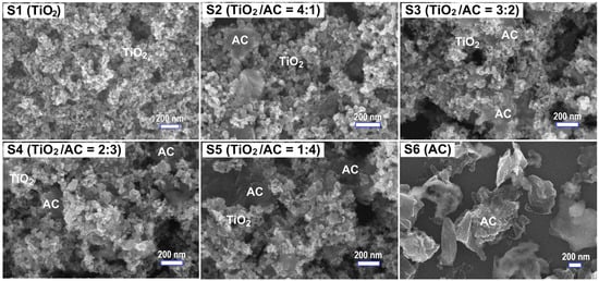 The typical scanning electron microscopy (SEM) images of TiO2 P25 (S1), TiO2/activated carbon (AC) composites prepared at various mass ratios (S2–S5), and AC (S6).