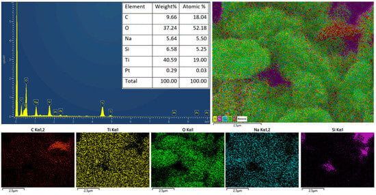 Figure 3 shows the surface morphology of the studied materials. TiO2 P25 exhibited uniform nanoparticles (NPs) with a size of 25–35 nm, while AC contained micron- and sub-micron particles. For TiO2/AC composites, TiO2 nanoparticles were well dispersed and decorated tightly with AC particles (Figure 3). The SEM images also reflect the contents of TiO2 and AC in the composites; e.g., TiO2 content decreases while AC content increases when we observe the SEM images from S2 to S5 (Figure 3). The elemental composition and distribution were illustrated by the EDS result (S4) in Figure 4. This composite has 18.04 at.% C, 52.18 at.% O, and 19.00 at.% Ti, which indicates a composition of AC/TiO2. Notably, small contents of Na (5.5 at.%), Si (5.25 at.%), and Pt (0.03 at.%) were observed due to the remaining after the surface activation process for P25 using NaOH 5 M, the Si substrate, and the Pt coating for taking SEM images, respectively. In addition, the EDS mapping in Figure 4 suggests a uniform elemental distribution, uniform decoration of TiO2 on AC, and possibly loading of TiO2 NPs inside the micro-pores and micro-channels of AC. The SEM and EDS results indicate the tight binding between TiO2 and AC that should support carrier transport for enhancing photocatalytic activity.
