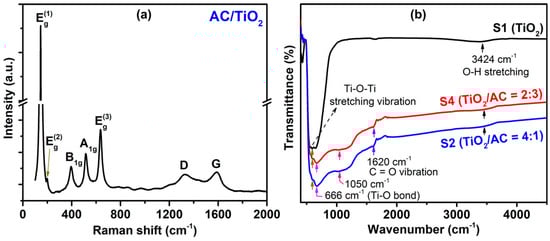 (a) A typical Raman spectrum of AC/TiO2. (b) FTIR spectra of TiO2 (S1), TiO2/AC (S2) and TiO2/AC (S4).