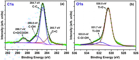 XPS spectra analysis of TiO2/AC (S2) was conducted to examine the chemical composition and bonding environment within TiO2/AC nanomaterials. In Figure 6a, the C1s spectrum can be deconvoluted into four Lorentzian-Gaussian peaks. The primary peak observed at 284.7 eV corresponds to C–C bonds, while three minor peaks appear at 283.7 eV for C=C bonds, 286.0 eV for C-OH due to –OH groups chemisorbed on the surface of TiO2, and 288.7 eV for C=O/COOH bonds [26]. This finding is consistent with previous studies on TiO2/AC [26] and TiO2-graphene systems [37]. In Figure 6b, the O1s spectrum is well-fitted with three peaks. Notably, a dominant peak at 530.5 eV corresponds to oxygen within the crystal lattice of TiO2, while two additional peaks at 531.7 and 533.0 eV are associated with Ti-OH and C-O/-OH, respectively. The present O1s spectrum result agrees well with that of TiO2/AC [26].