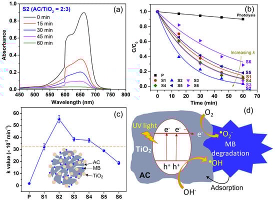 The photocatalytic activities of TiO2, AC, and TiO2/AC with different mixing mass ratios were studied by monitoring the photodegradation kinetics of MB (an organic substance with popular use as an organic pollutant model) under UV-Vis irradiation (120 mW/cm2). Figure 7a shows the evolution of the MB absorption peak (at ~655 nm) over the photocatalytic reaction time (t) using the TiO2/AC (S2). The peak intensity (associated with MB concentration) decreased with t, and this behavior is true for the other photocatalysts in this study (S1, S3, S4, S5, S6). The photodegradation kinetics by photolysis and photocatalytic processes using the materials are shown in Figure 7b, which obeys the Langmuir–Hinshelwood kinetic model with the first-order reaction rate constant (k), Ct = Co × e−kt, where Ct is the concentration of MB at time t (mg/L), and Co is the initial MB concentration (mg/L).