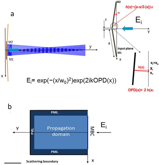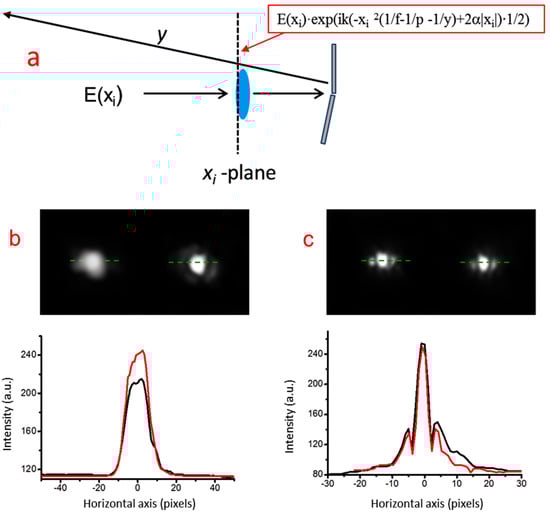 Such a long focal length was chosen to produce a focal spot of sufficient width to be reliably detected by the imaging system. In this case, the input field E(xi) undergoes a double phase change due to the lens and the bimirror, and it is modified in the analytical form shown in the red frame of Figure 11. The successive propagation is described by the integral of Equation (1) with the correct substitution of the phase terms.