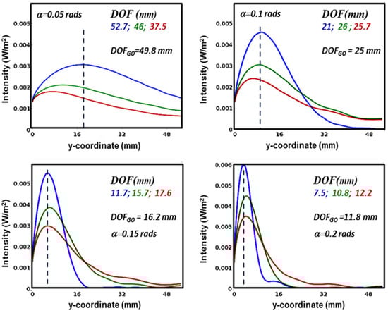 Axial intensities of the radiation at three different frequencies (0.1 THz, 0.2 THz, 0.3 THz) for the four values of the wedge angle α indicated in each figure, also showing the depths of focus as defined in the text for each frequency, marked with the appropriate color, as well as the depth of focus predicted by geometrical-optical considerations (DOFGO).