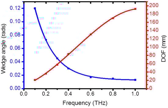 The wedge angle decreases non-linearly at higher frequencies, while the DOFη increases as expected, and at higher frequencies, αη decreases very slowly and becomes approximately independent of frequency from 0.6 to 1 THz.