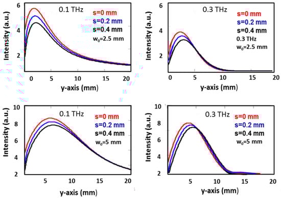 First, we have investigated the focusing properties versus the wedge angle α = 0, 0.1, 0.15, 0.2, rads at the two wavelengths λ = 3 mm (0.1 THz) and λ = 1.5 mm (0.2 THz). The results of these cases are shown in the plots of Figure 2.