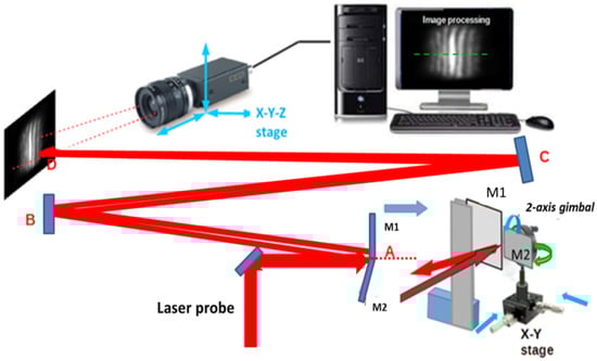 The optical setup is shown in Figure 6. The waist of the input probe beam (0.55 mm) is expanded to a beam waist w0 = 5 mm and sent to the bimirror probe. This consists of two custom rectangular mirrors with optical flatness λ/8 at = 633 nm. One of the two mirrors (M1) is mounted in a fixed position, while the other (M2) is mounted on a two-axis gimbal that can be moved in the x-y plane via a two-axis stage with 10 μm resolution. The mirrors are first brought into contact; then, M2 is moved laterally to create a small gap of about 0.1 mm to allow its free rotation, which is performed with micrometric precision. The gap can also be monitored by measuring the light power passing through it. The input beam is split by the bimirror into two beams which travel along an ABCD folding path to a screen.