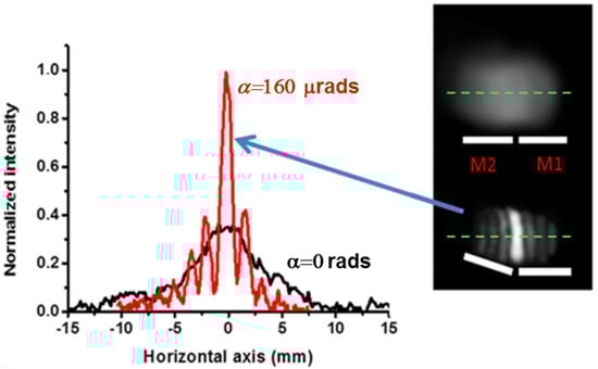 The sequence of the described operations is shown in Figure 7. When the mirrors are coplanar, the light distribution reproduces the input Gaussian light intensity distribution with a slight distortion due to the presence of the gap. As the tilt of M2 is increased, the central fringe becomes more intense and the process is iterated until it reaches maximum brightness.