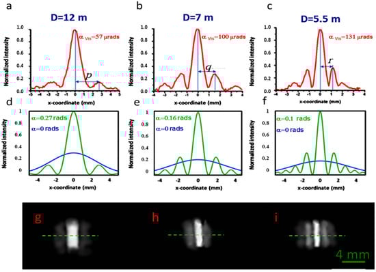 The transverse intensities of the focal distributions corresponding to three different distances D are shown in Figure 7. The distances between the central maximum and the maximum of the first lateral lobe correspond to wedges of αvis = 57 μrads, 100 μrads, and 131 μrads, which are calculated using Equation (3) with the distances p, q, r shown in the figure. We arbitrarily simulated the focusing conditions by considering wedge angles decreasing with frequency, since this corresponds to the largest DOF for a given frequency (see the Modeling section). For example, for the wavelength λ = 3 mm (0.1 THz, Mλ = 4761), we consider a wedge angle αvis = 57 μrads and D = 12 m and Mλ = 4761.