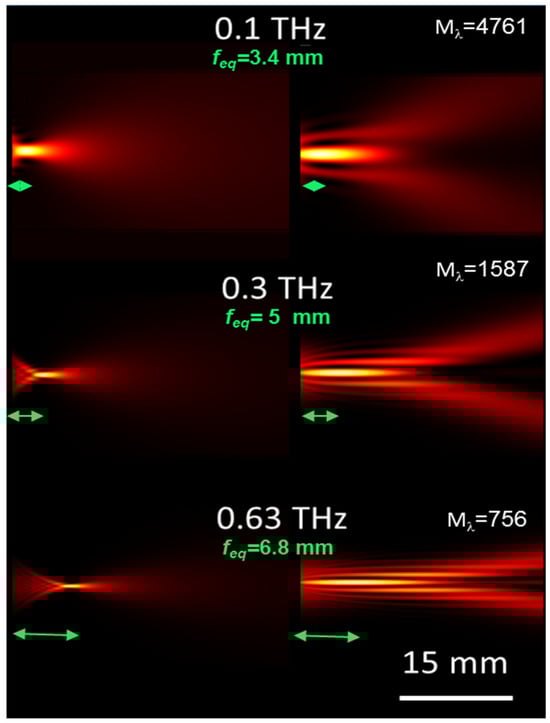 Similarly, well-defined peaked intensity distributions are found at distances of 7 m and 5.5 m. The traces in Figure 8b,c refer to the simulation of the focusing of the radiation at 0.33 THz (α = 0.16 rads) and 0.63 THz (α = 0.1 rads). The corresponding theoretical intensity plots calculated in the transverse plane at the axial focal positions are shown in Figure 8e,f. The increase in focal length of the bimirror compared to that obtained with a COE is more evident in Figure 9, which shows the 2D plots modeling the experimental situation at THz frequencies. The quantitative performance is summarized in Table 3. In all cases, the DOF expected for the bimirror is higher than that expected for the equivalent lens with an increase corresponding to ~14 times in the worst case of 0.1 THz.