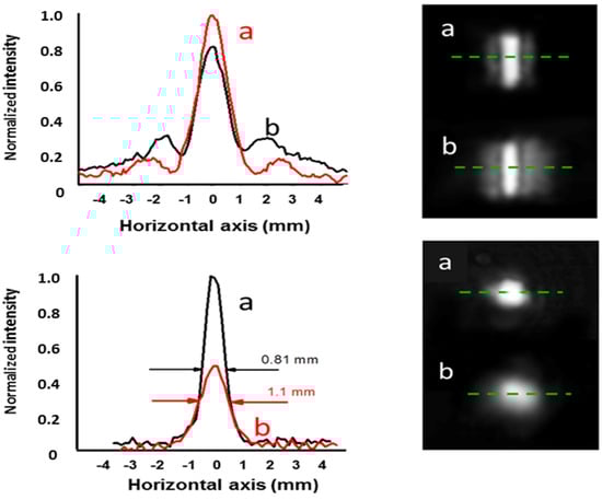 The corresponding depth of focus is calculated using the conventional formula DOF = ±1.22·λ·(f#)2, where f# is the f-number of the lens, giving DOF = 490 mm. After moving the screen 0.5 m away from the device, the central maximum is reduced by about half, as shown in Figure 10 (lower part), while the FWHM increases to 1.1 mm.