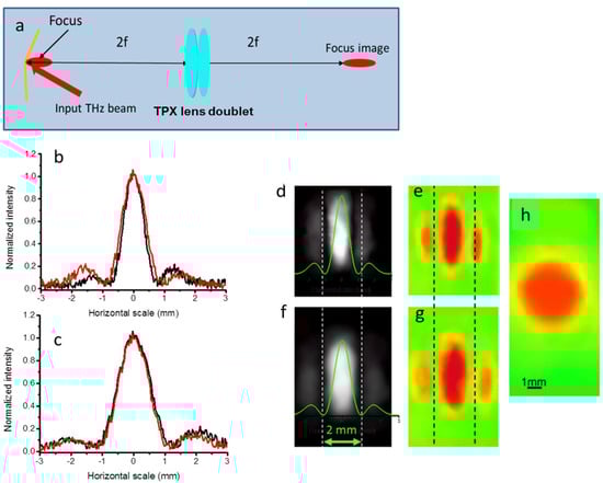 Considering the transformation rule of Equation (4), these parameters correspond to the simulation of the focusing of the THz radiation with a wedge angle α = 0.27 rads. The corresponding theoretical transverse intensity distribution at the focal length feq = D/Mλ = 3.4 mm is shown in Figure 8d, (see Table 3). The calculated DOF is 6.6 mm, while the focal width w = 1.6 mm, which agrees well with the experimental value, can be extracted from Figure 8a.
