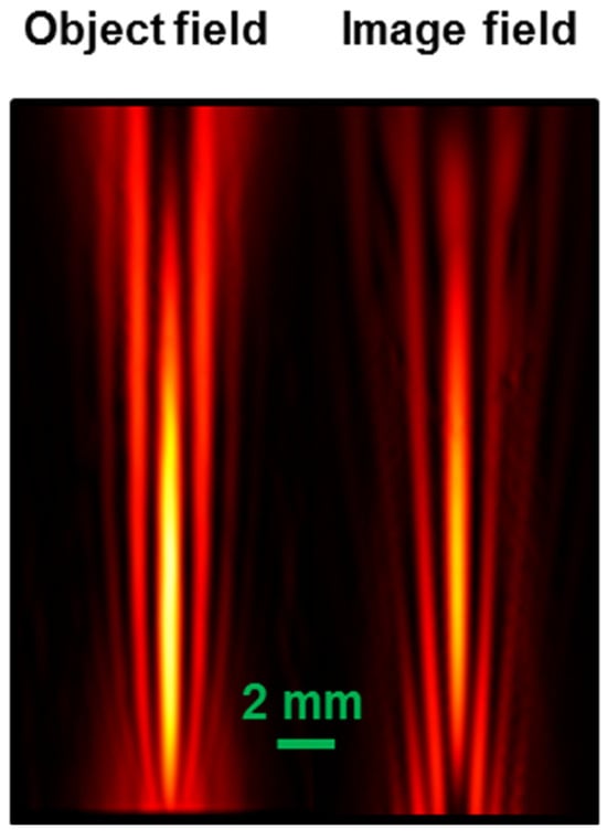 The choice of this configuration requires a few comments. Due to the diffractive effects, the conventional geometric–optical approximation for image formation, which assumes a δ-shaped impulse response, is no longer valid. Therefore, it can be difficult to obtain a good reproduction of the focal point. To this end, we calculated the focal length required to produce an image whose shape reasonably resembles that of the focal point. In fact, we found that choosing a focal length of 12.5 mm for the rely system, using a wavelength of 0.3 mm, produces only small deformations, as shown in the simulation in Figure 13.