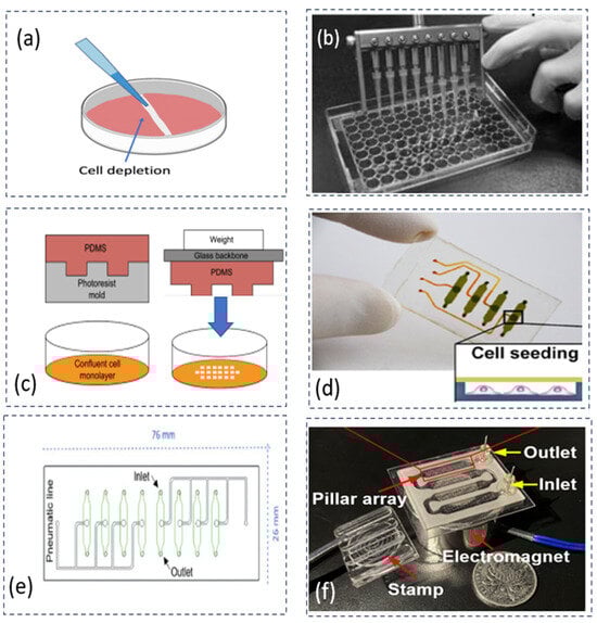 Various CMAs based on the mechanical depletion approach: (a) a pipette removing cells manually on a dish plate of cell culture [10], reproduced with the permission of [37]; (b) multiple pipettes creating eight CFZs simultaneously based on a commercially available CMA device called , adapted with the permission of [28]; (c) stamping devices applying consistent forces on cells to improve consistency in the size of CFZs, adapted with the permission of [27]; (d) a microfluidic device creating CFZs automatically with the pneumatic actuation by deflecting a flexible membrane, adapted with the permission of [29]; (e) a microfluidic device achieving a high consistency of CFZs with various forces, adapted with the permission of [30]; and (f) a microfluidic device creating 400 CFZs at one operation in a shear stress condition, adapted with the permission of [31].