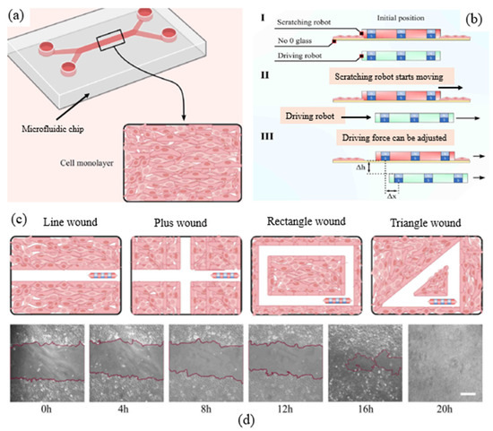 A magnetically controlled robot creating CFZs, adapted with permission from [32]: (a) cells cultured on a PDMS-based microfluidic chip; (b) the driving robot controls the scratch robot magnetically: (I) initial position of driving robot (green) and scratching robot (red), (II) the scratching robot driven by the driving robot starts moving, (III) the driving force required to move the scratch robot can be adjusted by the distance between the two robots horizontally (∆x) and vertically (∆h); (c) schematics of different geometries of CFZs (line wound, plus wound, rectangle wound, and triangle wound); and (d) images of line-shaped wounds at different time intervals. Legend white bar is equal to 400 μm.