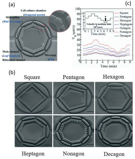 Structural design of a bio-inspired cell chamber for studying the uniformity of flow distribution, adapted with permission from [56]: (a) a cell chamber in octagonal shape; (b) cell chambers with different shapes including square, pentagon, hexagon, heptagon, nonagon, and decagon; and (c) the velocities varying in different shapes of cell chambers with the same inlet velocity. The scale bar is 300 μm.
