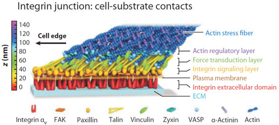 Various signal molecules in the deformation pathway: a protein network (i.e., talin, vinculin, paxillin, focal adhesion kinase (FAK), vasodilator stimulated phosphoprotein (VASP), and other proteins) interconnected between cells and the extracellular matrix (ECM). Adapted with permission from [74].