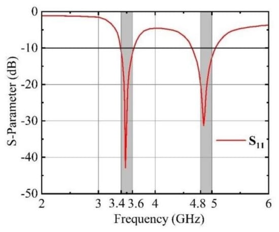 Figure 1b shows the side view of the side dielectric substrate. The distance between the top of the side dielectric substrates and the upper surface of the main dielectric substrate is 2.7 mm. The distances between Antenna 1 and Antenna 2, Antenna 2 and Antenna 3, and Antenna 3 and Antenna 4 are labeled as D12, D23, and D34, respectively. All of these distances are set at 23 mm, meaning D12 equals D23 equals D34. The perspective view of the antenna element is illustrated in Figure 1c. The outer surface of the side dielectric substrate features a double-rectangular ring patch, which is connected to a rectangular patch on the inner surface of the same substrate by a via. This rectangular patch, in turn, connects to the ground plane through a via on the top surface of the main dielectric substrate. On the inner surface of the side dielectric substrate, a T-shaped patch is fed by a 50 Ω feed line originating from the top surface of the main dielectric substrate. This feed line is connected to an external SMA connector via another via. A T-shaped slot is cut between every two adjacent elements to improve the isolation between antenna elements. The dimensions of a single antenna element measure 15 mm × 5 mm × 0.8 mm. The antenna element is designed to maintain an S11 value of less than −10 dB within the operational frequency band. The simulation software for the antenna design is HFSS 15 (high-frequency structure simulation). The antenna element operates in two frequency bands of 3.4–3.6 GHz and 4.8–5.0 GHz. Figure 2 illustrates the S-parameters of the antenna element.