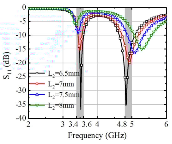 The S-parameters of the antenna element were analyzed and simulated with different values of L2 and L3, as shown in Figure 4 and Figure 5. Adjusting the length of L2 results in different current paths, which in turn affect the operating frequency. The precise impacts of these adjustments are detailed in Figure 4. Increasing the value of L2 leads to a shift of the two operating frequencies towards higher and lower frequencies, respectively.