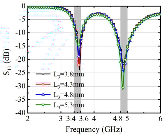 The influence of L3 on the antenna element’s performance is shown in Figure 5. As the length of L3 increases towards the feed patch, it affects the two operational frequency bands of the antenna element. The size of L3 can be used to effectively adjust the balance of the S-Parameters for both the lower and higher frequencies. The data in Figure 5 suggest that the antenna element’s impedance can be precisely matched to accommodate different scenarios.