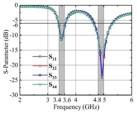 Due to the inherent symmetry within the MIMO antenna system, only the pertinent S-parameters are displayed to enhance clarity and simplicity. The simulated reflection coefficients for the MIMO system are presented in Figure 6.