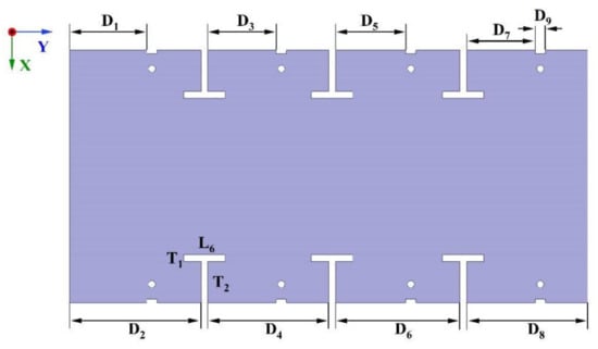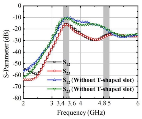 The T-shaped slot, denoted as T1, possesses a width of 2 mm, while both its length (L6) and height (T2) measure 12 mm. The distance from the feed element to the boundary is fixed at 20.6 mm. Adjacent T-slots are spaced at 36 mm intervals, indicating that D2 = D4 = D6 = D8 = 36 mm. The isolation characteristics after adding the T-shaped slot of the antenna system are illustrated in Figure 9, with the peak isolation point at S12 from −9.7 dB to −15.7 dB.