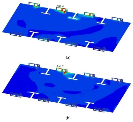 Surface current distribution of ground with T-shaped slots and antenna elements under different excitations: (a) Current distribution at 3.5 GHz with Antenna 2 excited; (b) Current distribution at 4.9 GHz with Antenna 2 excited.
