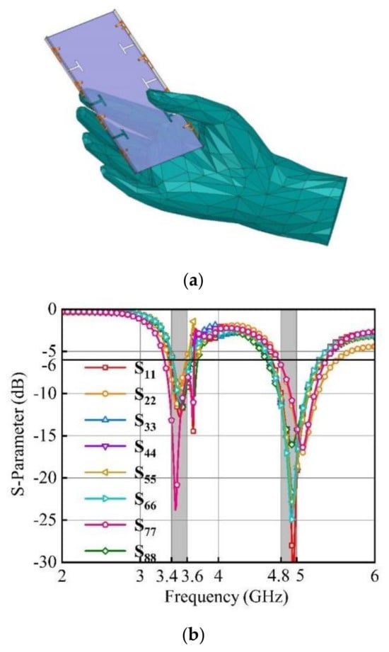 In this paper, the single-hand operation (SHO) mode is considered. Figure 10 illustrates the simulated working state of the device when used by a user. Ant. 3, Ant. 4, Ant. 5, Ant. 6, and Ant. 7 are identified as the most significantly affected antennas. Each of these antennas demonstrates a distinct deviation of nearly 0.5 dB in their respective S-parameters.