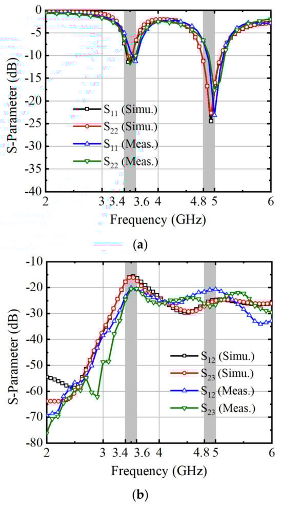 The measured results are compared with the simulation results in the figure below. Add 50 Ω terminals for ports other than the test port. The antenna’s measured S-parameters show frequency deviations due to manufacturing inaccuracies and manual assembly issues. Figure 13a illustrates the proposed antenna system maintaining a −6 dB threshold within the operational frequency bands of 3.4–3.6 GHz and 4.8–4.9 GHz, ensuring its effectiveness in practical applications. Furthermore, Figure 13b demonstrates isolation levels exceeding 20 dB between different antenna elements.