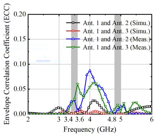 The envelope correlation coefficient (ECC) stands as a cornerstone metric within multiple-input multiple-output (MIMO) systems, crucial for gauging the correlation between signals received by multiple antennas. Its significance lies in its ability to indicate signal correlation levels, directly impacting the system’s diversity performance and, consequently, its overall efficiency and reliability. In practical MIMO deployments, a low ECC value signifies reduced correlation and enhanced spatial diversity, vital for mitigating fading effects and combating interference in wireless communication channels. By leveraging ECC analysis, engineers can refine antenna designs, fine-tuning them to optimize system performance under dynamic and challenging propagation conditions. This analytical approach not only aids in maximizing data rates but also ensures robustness in real-world wireless communication scenarios. Therefore, ECC serves as a pivotal tool in the arsenal of MIMO system optimization, empowering engineers to craft resilient and efficient wireless communication solutions. The ECC can be calculated by Equation (1), and the calculated ECC is shown in Figure 14. Notably, the ECC value is below 0.066 within the desired frequency band, which falls below the threshold of 0.5 required for normal MIMO antenna operation.