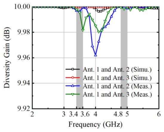 Diversity gain (DG) plays a pivotal role in assessing the efficacy of MIMO antenna systems, offering insights into their ability to improve signal reliability and robustness in challenging propagation environments. Derived from the envelope correlation coefficient (ECC) calculation, DG quantifies the system’s capacity to exploit spatial diversity, thereby mitigating the adverse effects of fading and interference. By leveraging multiple antennas strategically positioned, MIMO systems can achieve significant diversity gains, enhancing signal reception quality and overall system performance. This diversity enables the system to capitalize on multipath propagation, effectively mitigating signal fading and enhancing communication reliability. As a result, DG serves as a critical metric for evaluating and optimizing MIMO antenna designs, ensuring they deliver superior performance in real-world wireless communication scenarios. DG can be calculated by Equation (2). The computational outcomes are depicted in a graphical representation, illustrated in Figure 15, indicating values exceeding 9.97 dB across operational frequency bands.
