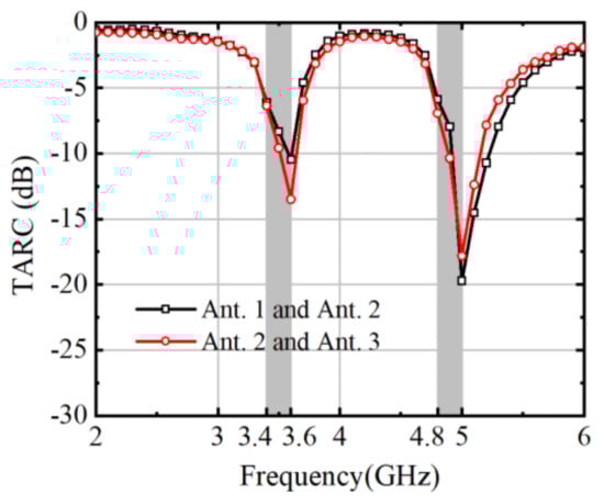 Figure 16 plays a pivotal role in illustrating the significance of the total active reflection coefficient (TRAC) in evaluating MIMO antenna system performance. TRAC, representing both magnitude and phase aspects of reflection coefficients across active ports, offers insights into impedance matching and radiation pattern characteristics. Particularly crucial in MIMO setups, TRAC analysis aids in identifying impedance mismatches and optimizing antenna designs for efficient signal transmission and reception.