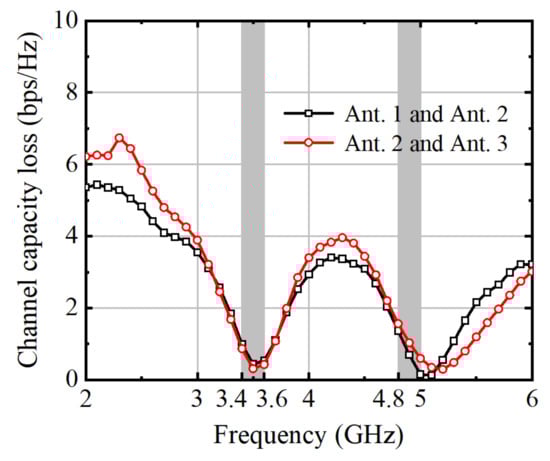 Assessing the channel capacity loss (CCL) in MIMO antenna performance is crucial for understanding the correlation between signals received by multiple antennas. CCL quantifies the degradation in channel capacity due to correlation among received signals, which can arise from factors such as antenna spacing and environmental conditions. By evaluating CCL, engineers gain insights into the extent to which spatial diversity is effectively harnessed in the MIMO system. High CCL values indicate increased correlation and reduced diversity, potentially leading to diminished system performance in terms of data throughput and reliability. Therefore, understanding and mitigating CCL is essential for optimizing MIMO antenna configurations and maximizing the system’s capacity to exploit spatial diversity for enhanced communication performance. The CCL can be calculated by Equation (3), and shown in Figure 17. The maximum allowed CCL value for MIMO antenna elements is 0.4 bps/Hz or less. Figure 17 illustrates that the CCL value between the correlated antenna elements is below 0.33 bps/Hz at 3.5 GHz, indicating reduced losses.