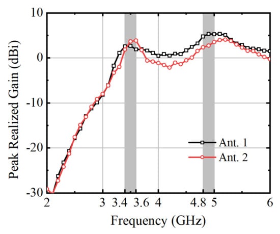 Measured antenna peak realized gain.