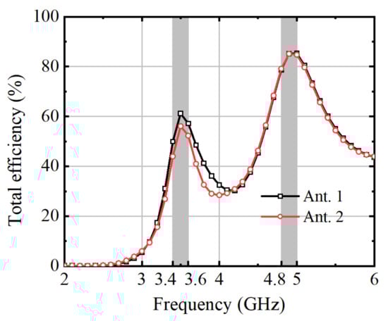 5G networks offer higher data rates and lower latency compared to previous generations, enabling faster and more reliable wireless communication. In different countries and regions, the 5G mobile wireless standard has been assigned distinct frequency bands. For example, four telecommunications operators, namely China Mobile, China Telecom, China Unicom, and China Broadnet offer 5G services within Mainland China. The frequency band n77 (3.3–3.4 GHz) is jointly used by China Telecom, China Unicom, and China Broadcasting for 5G indoor coverage. The n78 band (3.5–3.6 GHz) is utilized by China Unicom and China Telecom. The n79 frequency band (4.8–4.9 GHz) is assigned to China Mobile. The widespread adoption of 5G mobile communication systems has heightened the importance of antenna design for 5G mobile devices. MIMO technology enhances wireless communication capacity and quality by utilizing spatial diversity and multiplexing to establish parallel data streams, improving efficiency and reliability [,,]. The utilization of MIMO antennas in 5G smartphones enhances communication efficiency and elevates data transmission rates.