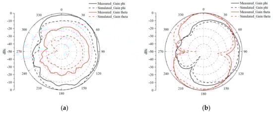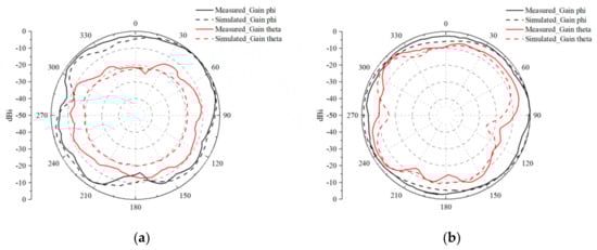 The 2D radiation patterns of Antenna 1 at the respective resonance frequencies are presented in Figure 20 and Figure 21. Moreover, a comparison between the 2D directional characteristics of the test and simulation results demonstrates a high level of similarity in the overall directionality. This close alignment between the measured and simulated radiation patterns validates the accuracy and reliability of the simulation model in predicting the antenna’s performance. Engineers and researchers can have confidence in using simulation tools to predict MIMO antenna behavior accurately, thus streamlining the antenna development process and reducing the need for extensive testing. The consistency between the measurement and simulated results also provides valuable insights for future MIMO antenna design iterations and optimizations, enabling engineers to leverage simulation data to explore various design parameters and configurations, aiming to further enhance antenna performance and meet specific application requirements. Overall, the close match between the 2D radiation patterns obtained from both measurement and simulation demonstrates the robustness and reliability of the proposed MIMO antenna design, paving the way for its successful integration into diverse wireless communication systems and applications.