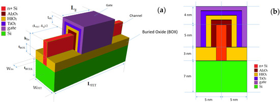 The continuous downscaling of MOS devices is indispensable for increasing the transistor density and performance, leading to efficient chip functionality at higher speeds. However, this scaling poses challenges such as severe short channel effects (SCEs), increased fabrication costs, and difficulties in device processing [6,7,8]. Multi-gate MOS device structures like FinFETs, which use multiple gate electrodes and an ultrathin body, have been developed to address these challenges, showing an excellent device performance at scaled parameters. The use of metal gates has become attractive due to their chemical stability with high-κ gate dielectrics and the ability to maintain higher threshold voltages while acquiring high gate stack stability [9,10,11,12,13,14].