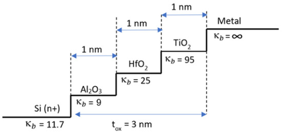 Regarding κ-grading, we mean that, among selected dielectric materials to be used for stacking, Si channel deposition should be followed by dielectric material with lowest bulk dielectric constant , followed by material with higher , then followed by a material with higher again, until gate is reached like in Figure 2. We mainly target dielectric permittivity matching of gate oxide at both ends of Si channel side and metal side. Thus, as permittivity matching at both ends of the gate oxide is considered, we implement this concept herein by κ-grading, keeping permittivity of neighboring materials as close as possible.