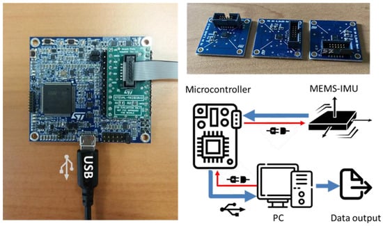 In this study, we examine three commercial, low-power digital MEMS-based Inertial Measurement Units (referred to in the following as “MEMS 1”, “MEMS 2”, and “MEMS 3”) manufactured by STMicroelectronics, specifically the LSM6DSR model []. Each IMU, belonging to the same production line batch, consists of a 3D accelerometer, a 3D gyroscope, a charge amplifier, and an analog-to-digital converter. For the purposes of this investigation, the 3D gyroscope is not utilized and remains turned off, since only sensitivity related to acceleration is investigated. The digital MEMS accelerometers are connected to an external microcontroller by STMicroelectronics (Agrate Brianza, MB, Italy) model STEVAL MKIGIBV2 [] through a serial cable. This microcontroller acquires the digital sensor data, communicating with a PC via a USB cable, as schematically shown in Figure 3.
