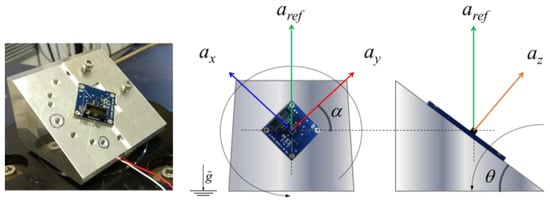 The experimental set-up allows one to generate a projection of the vertical reference acceleration, aref, along three axes simultaneously. The calibration method and the experimental set-up, shown in Figure 4, are described in detail in [,].