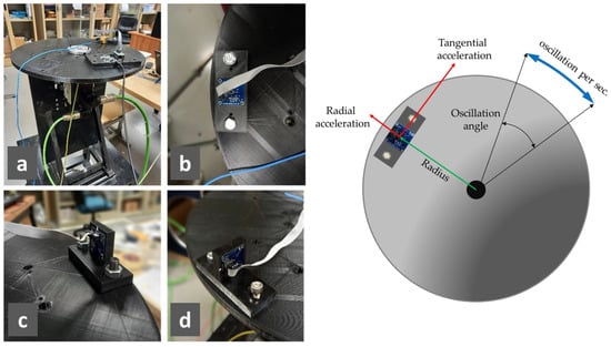 Pictures of the rotating test bench: (a) lateral view (the support for the microcontroller is visible); (b) support to orient the X- and Y-axis in the radial or tangential direction; (c) support to orient the Z-axis in the radial direction; (d) support to orient the Z-axis in the tangential direction. Schematic representation of the rotating test bench functioning.