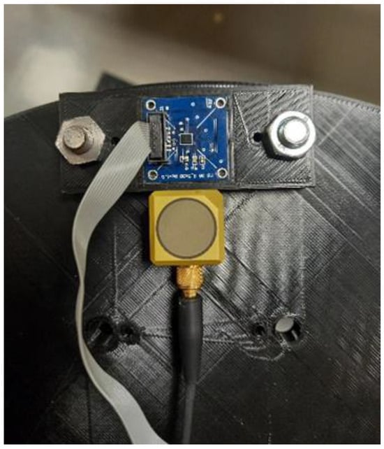 In addition, a reference IEPE (integrated electronics piezoelectric) sensor (Model TLD356B18 by PCB Piezotronics (Depew, NY, USA), Measurement Range: ±5 g) was placed against the MEMS support, as indicated in Figure 6, using double-sided tape, always in such a way that one axis is radial and one tangential; the distance of the sensitive element from the rotation axis is measured the same way as the MEMS sensor, and the result is equal to 145 mm.
