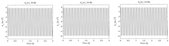 Experimental metrological sensitivities are determined by applying an almost constant peak amplitude of 10 m/s2 at 5 Hz, 10 Hz, and 20 Hz. These sensitivities are then compared with the expected acceleration values calculated from Equation (1) taking into account inclination and rotation angles. Any difference between the experimental acceleration values along the three axes and the expected values depends on potential variations in the sensitivities of the sensors and potential misalignment within them. Once these differences are identified, adjustments can be made to fine-tune the actual metrological sensitivities of the IMU. In Figure 7, the accelerations along the X-axis, Y-axis, and Z-axis, at 10 Hz, as a function of time, are shown.