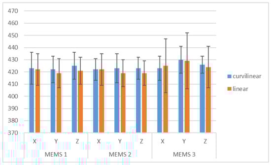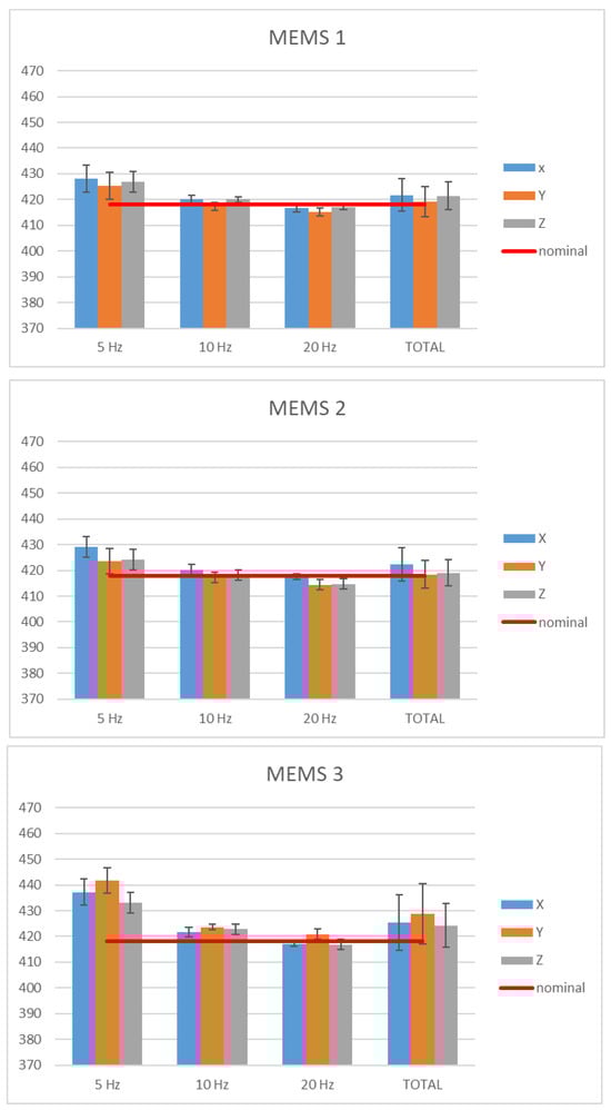 Similarly, with respect to the sensitivity value provided by the manufacturer, which is unique to the three axes and equal to 418 D16-bit-signed/(m/s2) ± 1% of tolerance (standard deviation obtained by hypothesizing a rectangular distribution), no significant differences were detected for the sensitivities of the X, Y, and Z axes for all the examined accelerometers.