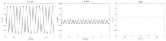 It should be noted that in Equation (2), a sinusoidal square function () is present, and trigonometric formulas explain that it is characterized by double the frequency; for this reason, the radial acceleration has a double frequency compared with the tangential one.