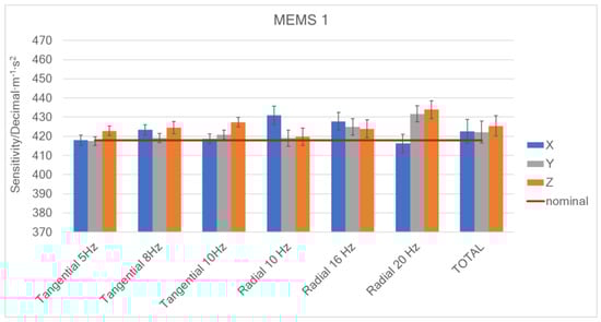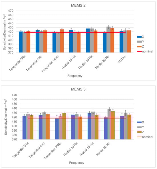 It is noted that the variability, which in the case of sensitivities determined in the tangential direction is on average equal to 0.3%, increases to approximately 1% in the case of the radial ones. The reasons may lie in the smaller amplitude of the radial accelerations, which are placed lower in the measurement range of the accelerometers (both the MEMS and reference ones).