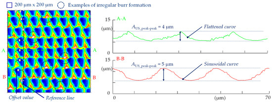 The characterization of the microstructured surface is based especially on geometrical aspects and on defined areal surface parameters. To analyze those values in detail, a laser scanning microscopy (LSM) image was taken with a Keyence VK-9700 (Keyence Corporation, Osaka, Japan) instrument applying a 50× objective in the middle of the milling path. At this position, the microstructure should be very close to the geometrical design due to the negligible effect of the path curvature. It should be noted that recutting by the tool was avoided, because its diameter was larger than the length of the specimen surface and the UVSM process was stopped directly above the middle of the surface. The size of the analyzed measurement field was reduced to 0.2 mm × 0.2 mm, since a sufficient number of relevant structural elements is thus represented in each direction. This image also allowed for cross-sections in the cutting direction, whereby the measured amplitude AUS_peak-peak, which is defined in the case considered as the peak-to-peak value of the analyzed sinusoidal surface shape, could be determined. Based on five individual measurements, a mean value was calculated. However, it should be noted that measurements were taken at suitable locations: while values of around 4 µm were measured directly in the valley ground due to the smoothing effects caused by the cutting edge rounding (section A-A), the desired 5 µm can be detected close to the peaks of a path (section B-B), as shown in Figure 1. In addition, the different curve types can be seen, and some surface imperfections such as increased burr formation are marked as examples.