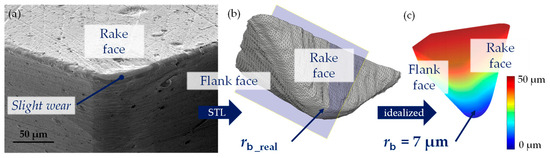 The tool used in the UVSM process for microstructuring the mentioned specimen was analyzed by SEM with an EVO MA25 (Carl Zeiss AG, Oberkochen, Germany) and LSM in unworn and worn conditions, Figure 2. Based on the geometrical specification of the uworn tool, especially the cutting edge radius, a virtual tool was designed. Therefore, the cutting edge radius was averaged from 20 profiles measured along/in the area of the corner radius and determined as rb = 7 µm. The clearance angle was 40°, the rake angle 0° and both the angles of the major and minor cutting edges were 45°.