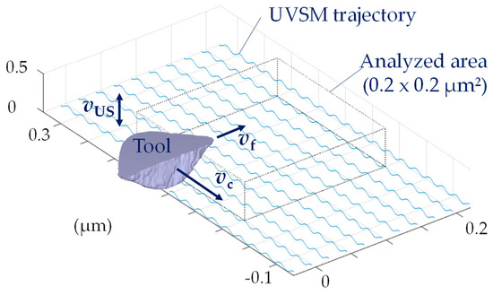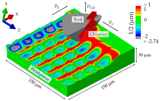 As shown in Figure 4, the tool moves in a sinusoidal path with an ultrasonic vibration amplitude of 5 µm (peak–peak). The frequency of 19.7 kHz and the cutting speed of vc = 30 m/min led to structural distances of 25 µm. In order to study the microstructured surface after the machining process, a rectangular cuboid geometry with the dimensions 150 µm × 150 µm × 30 µm was considered as the workpiece. The tool was positioned so that the rake face was orthogonal to the cutting direction (Z-direction, Figure 4).